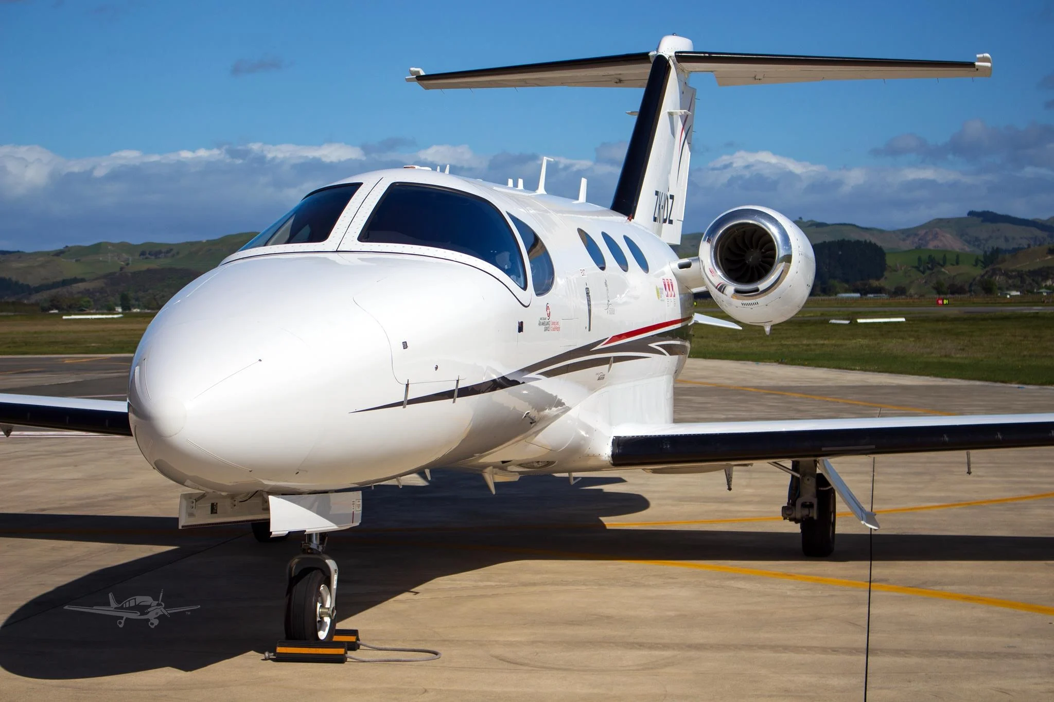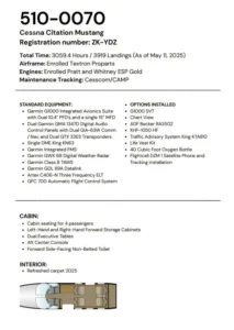 The Citation Mustang is powered by two P&WC PW615F turbofans with 1,460 pounds of thrust. It was designed with aluminum alloy construction, swept low-wings, T-tail, and retractable tricycle gear. The interior consists of a toilet, two crew seats and up to four passengers seats.