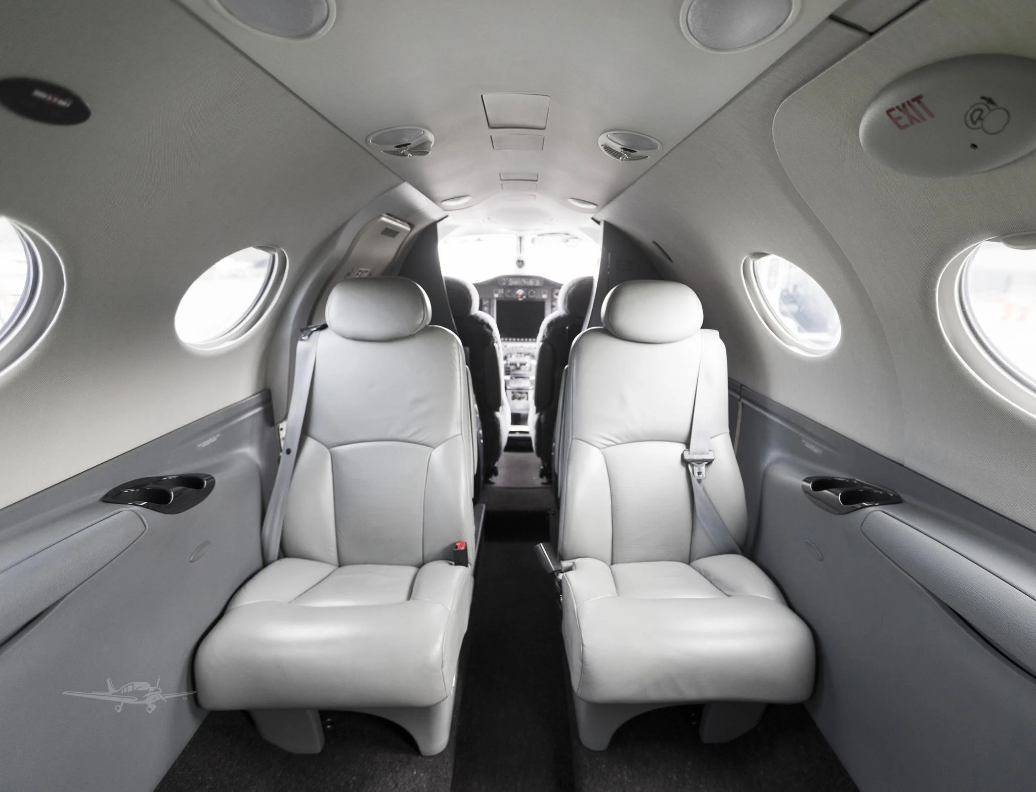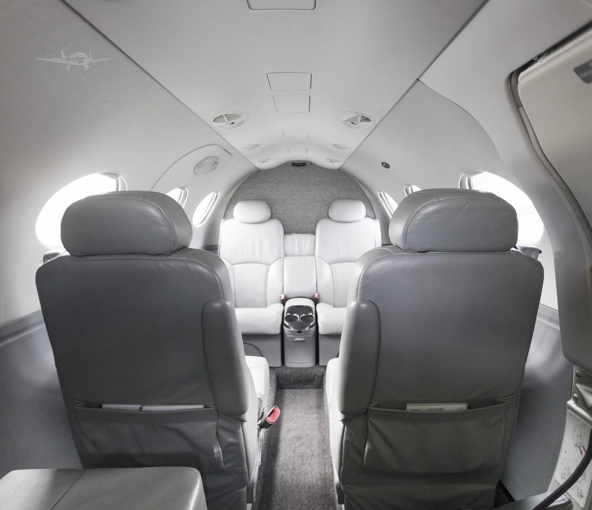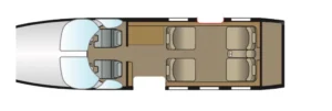 Standard Four Passenger Club configuration Grey Leather Seating with Lefthand and Righthand Forward Storage Cabinets, Dual Executive Writing Tables, Aft Centre Console, and Side-Facing Non-Belted Grey leather Lav.